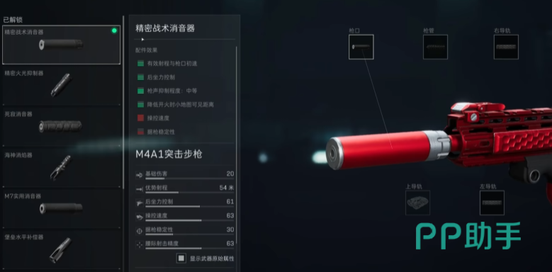 枪口采用精密战术消音,因为这套是主打短突,也就是绕到对方后面偷袭,需要消音器隐匿。枪管采用M4精英标准枪管,配种最大化长度最小化,因为是近中距离的战斗,初速就不是那么侧重了。