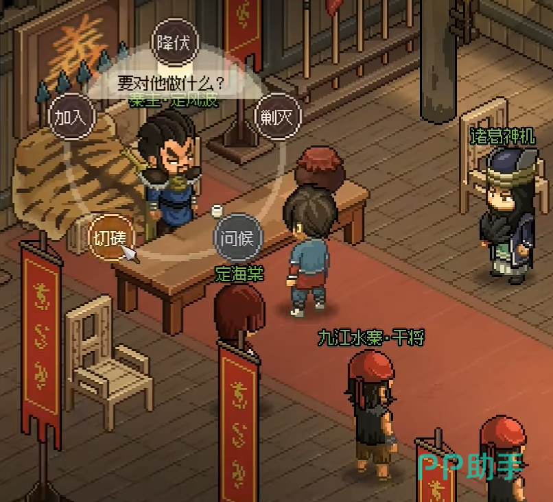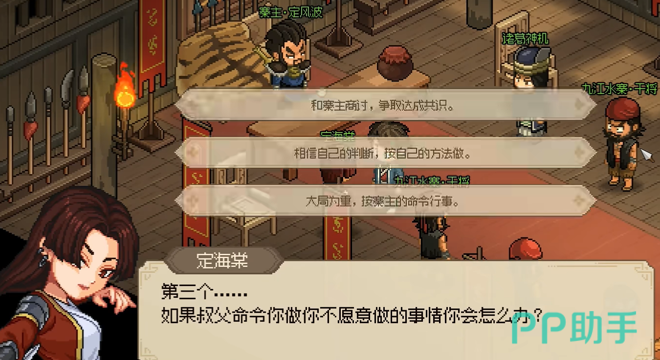 定海棠,玩家在加入后会对玩家进行两次考验,首先第一次是单挑,玩家们很容易就将其击败。第二次考验则是会要求我们回答一些问题,这些问题的答案玩家们可以以忠心为九江水寨来进行选择即可。之后我们和定海棠的关系会增加10点,九江水寨则是会增加2点。