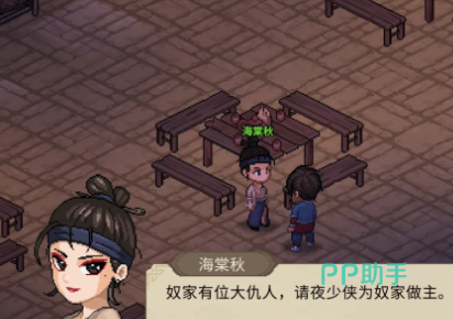 首先我们需要先前往长安客栈,进门以后会发生官兵勒索的事件,选择静观其变后角色海棠秋会出面周旋,然后我们就找海棠秋互动,在和他闲聊的时候如果花四娘在队伍里的话会有额外对话,提升好感度。
