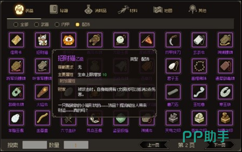 最后要介绍的是招财猫,它能让玩家在被攻击时身上每有一文铜钱就抵挡两点的伤害,虽然这件物品在战斗上虽然没有太大的效果,但是它能让我们提升获取金钱的几率,对于哪些喜欢探索或者是购买装备的玩家而言十分重要。