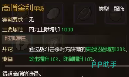 第三个要介绍的高僧舍利,它能在开局的时候增加玩家1000的内力、攻击力和防御力各提升10%的同时通过战斗击杀敌人的实战经验提升30%,除此之外高僧舍利还能在一些任务的关键钥匙,既能带给玩家不小的功效,又能让玩家推进剧情。