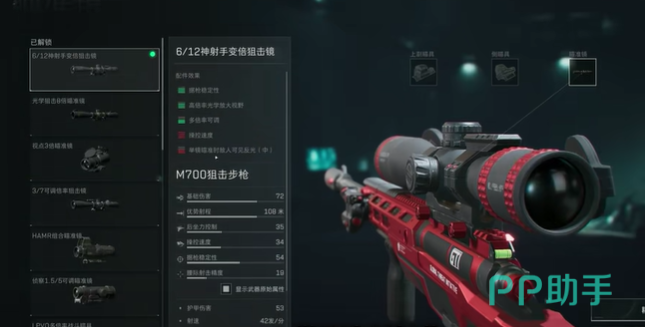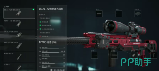 m700可以进行多次改装,在枪管上选用精英长线形,且后期改装可以加入死寂消音器,大幅度增加有效射程与杀伤力。枪身加装先进类操作系统、幻影握把与红色涂装,帅气又拉风的外观绝对亮眼。瞄准上加装激光镭射能够将消音器产生的初速损失与操作缺失很好的弥补,打枪又快又准。同时准星镜可以加上微调处理器,精确刻度来调整成最适合自己的手感。