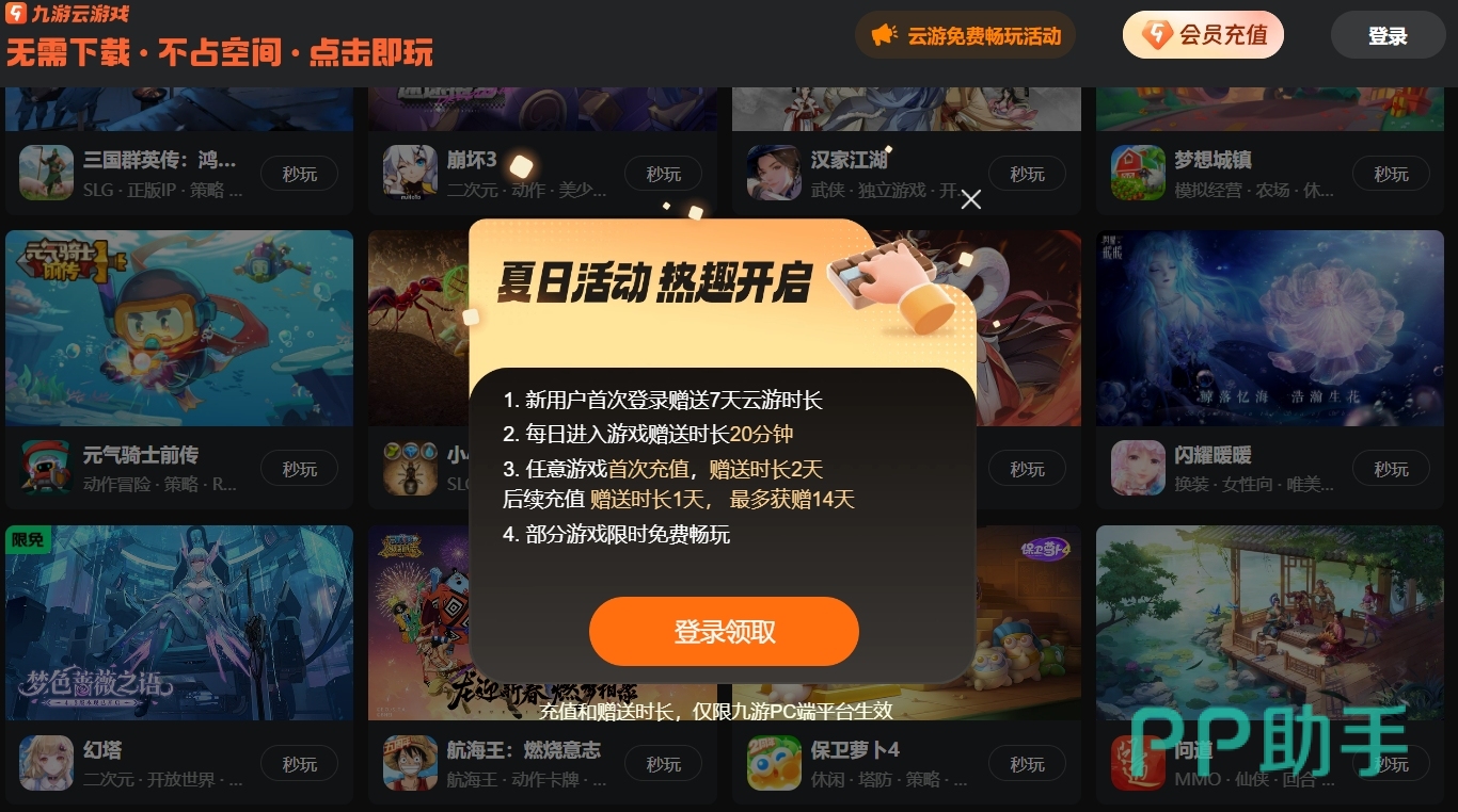 如果你是九游平台的老玩家,日常登录九游云游戏平台还会获得额外的福利回馈。每天登录游戏,不仅有机会领取到20分钟的额外游戏时间,还能积累更多游戏时长。而对于首次充值的用户来说,九游更是准备了超值奖励——一旦你进行了第一次充值,将会立即获得两天的免费游戏时长,让你更愿意每天“打卡”九游云游戏平台。