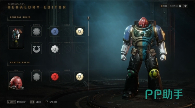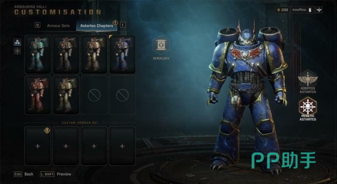 在游戏中的自定义选项,直接就是包含了“阿斯塔特战团”选项卡,大家可去访问代表不同的星际战士战团,以及不同的预设,玩家随后更是能主动去定制属于自己的盔甲涂装、徽章和颜色等图案,整体的自由度还是比较高的。