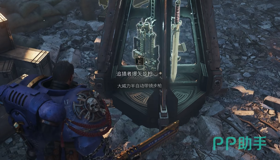 刚落地我们就去神殿外围进行查找,看到怪物就清理,这里大家可以使用链锯刀的,近战伤害很高。神殿外面的废墟上,是可以找到补给装备的,那就是追猎者爆矢步枪,可以过去拿,威力很大,应对怪物潮的时候好用。