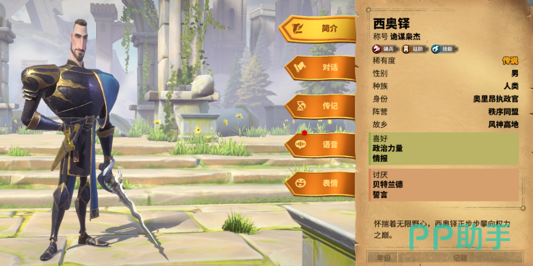 他的最后一个被动能让自身在使用技能攻击敌方部队后,获得一层玲珑印记,该印记最多可以叠加三层,西奥铎在下一次释放怒气技的时候会清空所有印记,每一层印记都能让怒气技的伤害提升10%,脱离战斗也会使得印记清空,他的觉醒技能让部队普通攻击伤害降低25%。