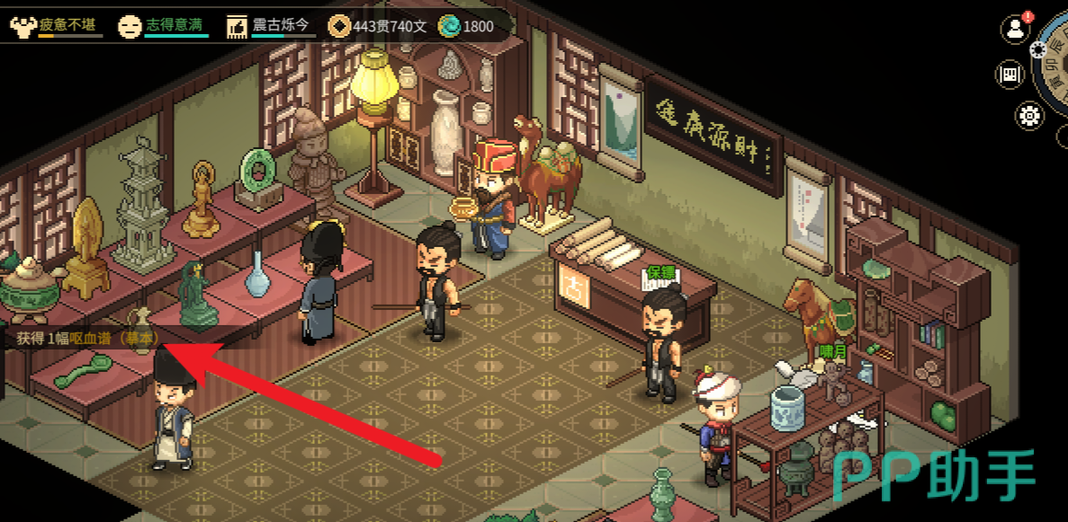 当好感度达标以后,点击一下左侧的木架子,呕血谱就放在木架子上面,点击一下获取便可以立即得到呕血谱的摹本了,这里大家需要注意的是千万不要没有刷好感度就私自去获得呕血谱的摹本,这种行为会被老板视为盗窃。