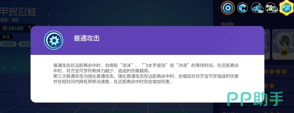 甲贺忍蛙的普通攻击并没有特殊效果,但其被动技能可以在生命值小于或等于一半时,增加它的伤害和移动速度,使其在残血状态下变得更加危险,他的一技能是一个远程效果,使用泡泡进行攻击,并能在短时间内降低对手的移动速度,提供了控制敌人的能力,而当呱呱泡蛙达到5级后,它会出现两个分支技能供玩家选择,玩家需要根据战况和个人喜好进行选择,但只能二选一。