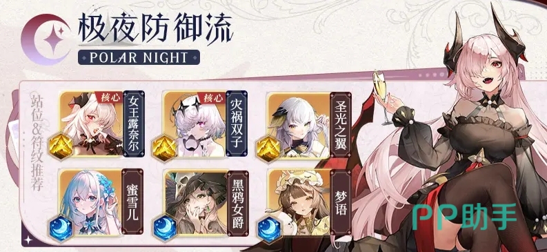 其中女王露奈尔主打的就是强大的真伤输出和防御生存,是阵容的主C,格蕾丝具有不俗的控场效果,为队伍提供稳定的支持,灾祸双子则是增强队伍的生存防御能力,附带眩晕和降低敌方终结技能量,蜜雪儿这里可去选择黯月符纹减伤同时获得不菲的减能能力,强化控场,薇尔公主可去选择免伤符纹进一步提升生存能力,菖蒲作为输出角色,选暴击符纹最大化伤害输出。