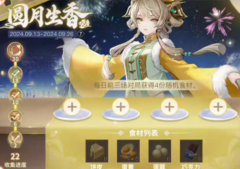 除了皮肤外,游戏官方还为我们准备了其他的活动,首先介绍的便是圆月生香,这个活动是每日前三场战斗均可以获取4种随机食材,并可以使用获取到的食材来完成月饼的订单,完成之后可以获取到丰厚的奖励。
