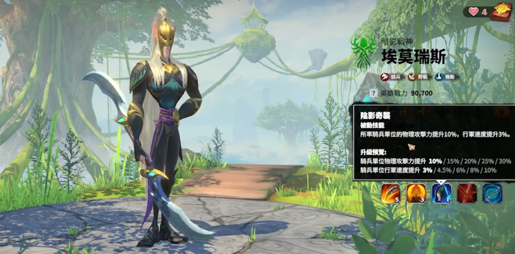 在这个游戏里,紫色橙色英雄是有4个技能的,都升到满级5级之后会解锁觉醒技能。这四个基础技能通常是由1个主动怒气技能和3个被动技能组成,但并不是获取英雄后就都全部解锁的。