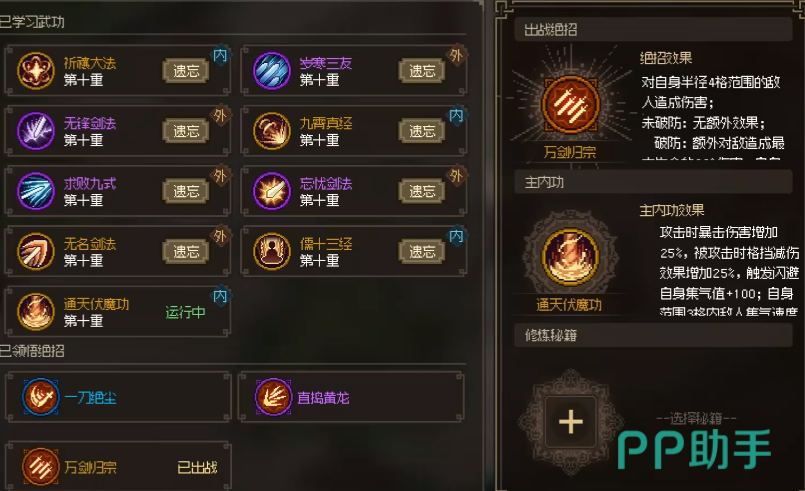 游戏里可以选择的武功秘籍有很多,通过修炼这些武功可以感受到武侠江湖世界各个门派的风采,在修炼的时候需要选择出你最需要并且最喜欢的,在对战的时候可以用刀,可以用拳,当然还会有件或者是其他的武器可以使用,在修炼的时候要着重去选择对自身武器有帮助的,这样才能对角色能力有极大的提升作用。