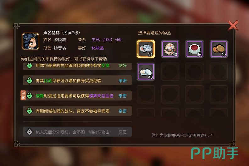 大侠立志传顾倾城入队方法以及如何和这个角色结缘,都已经分享出来了,和游戏里其他角色结缘,基本上也需要采取的是相同的方法,需要在游戏里多去完成特定的任务,提升和角色之间的关系,才能更加快速地邀请对方加入队伍或者结缘。