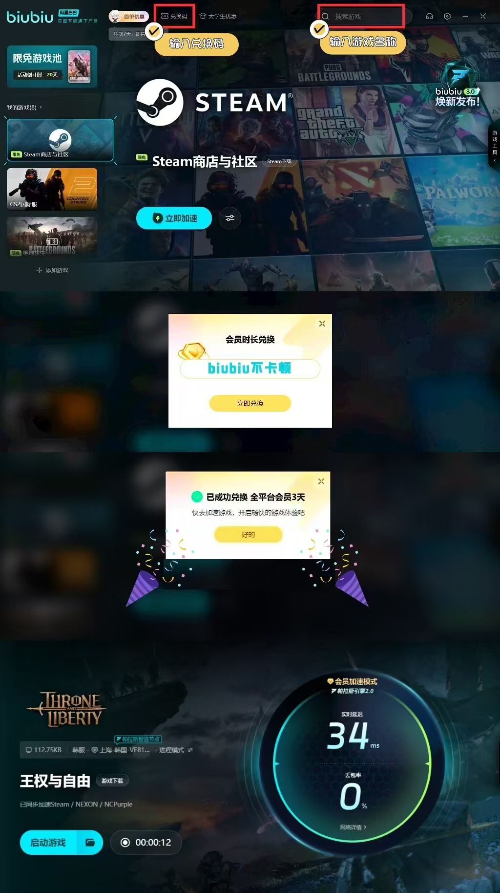 为了获得更加流畅的游戏体验,使用biubiu加速器可以显著优化网络体验。它提供专线和单独设计的游戏加速通道,让你享受0丢包、0延迟、0卡顿的流畅体验,即使在副本内刷装备也不会掉线。现在加入biubiu还可以获得丰厚福利,通过口令【biubiu不卡顿】即可享受高达3天的免费加速时长,无论新老用户都可以使用。新用户注册后还可额外获得24小时的加速时间,总共可享受96小时的免费加速。