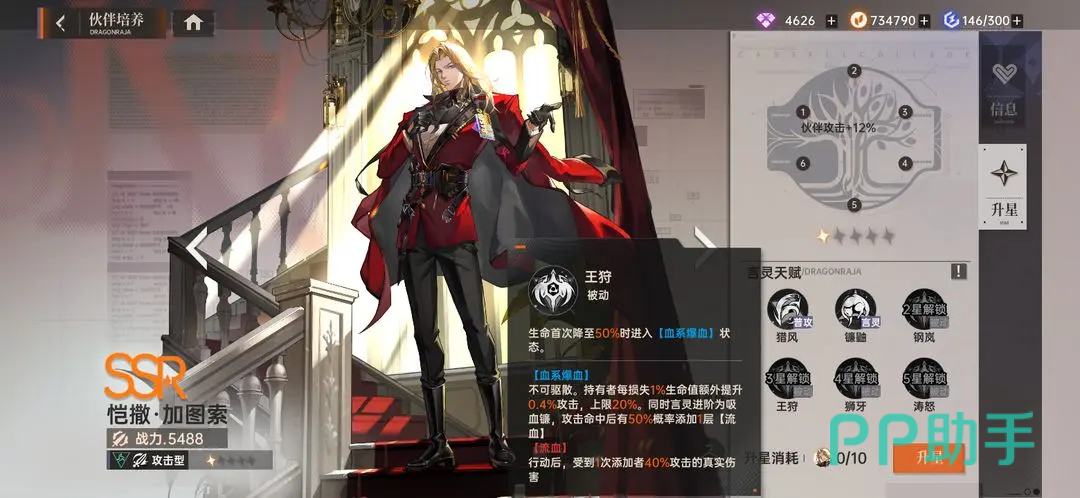 流血会在行动后,给敌人添加40%的真实伤害;”狮牙”作为四星的被动,可以提高30%攻击力;最后是五星被动”涛怒”,血系爆血状态下,受到的直接伤害的25%会让生命比例最高的队友承担。