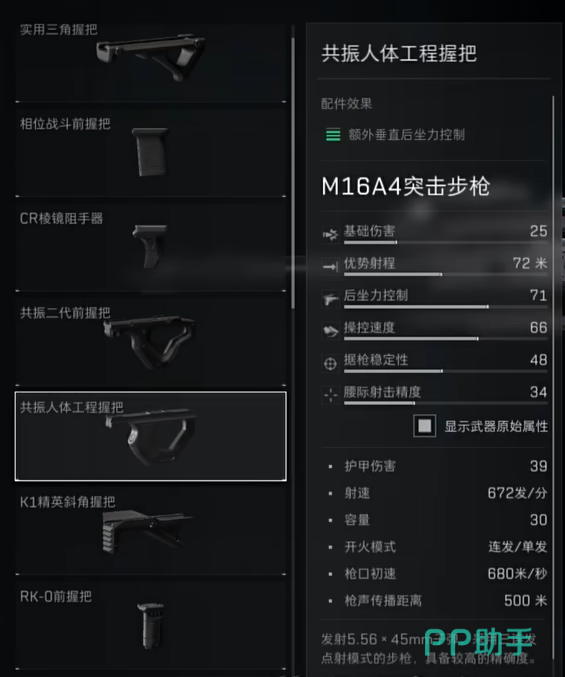 第一个介绍的配置特别适合喜欢在战场上灵活应对的玩家。首先用到的是海神消焰器,它不仅能有效降低枪口火焰的暴露,还能在三连发模式下提升你的射击隐蔽性。人体工程学握把也是个绝佳选择,主要因为M16A4的垂直后坐力是个关键点,降低垂直后坐力能让你在单点和三连发时都更加稳定。配上30发快速弹匣和快拔弹匣套,你将不会因为换弹而拖慢节奏。