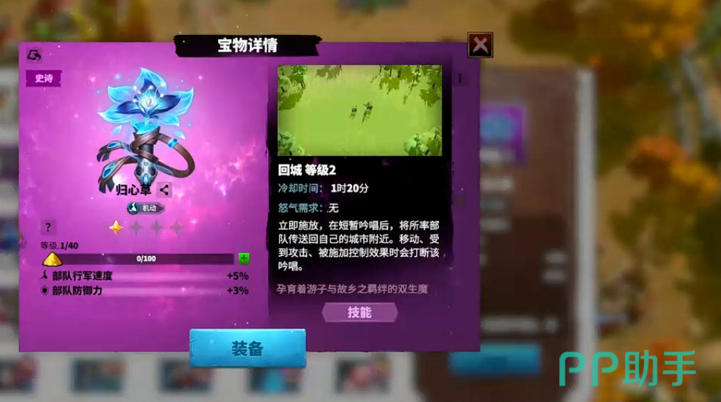 如果玩家的背包之中不存在有以上这两种金色的道具,也可以直接选用归心草和小丑面具这一类的下位道具,由于归心草无论是怎样的角色都可以携带,它在提升部队行军速度的同时还能够增加部队的防御能力,对于玩家前期和中期资源比较匮乏的时期,该宝物可以用来过渡。