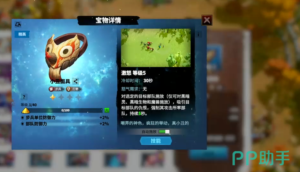 小丑面具则是能够增加步兵的防御能力,其基础技能的冷却时间比较短对于野外刷怪而言是非常好用的一个宝物,在前期和中期,携带维德尔这个英雄,可以使用小丑面具进行聚怪。
