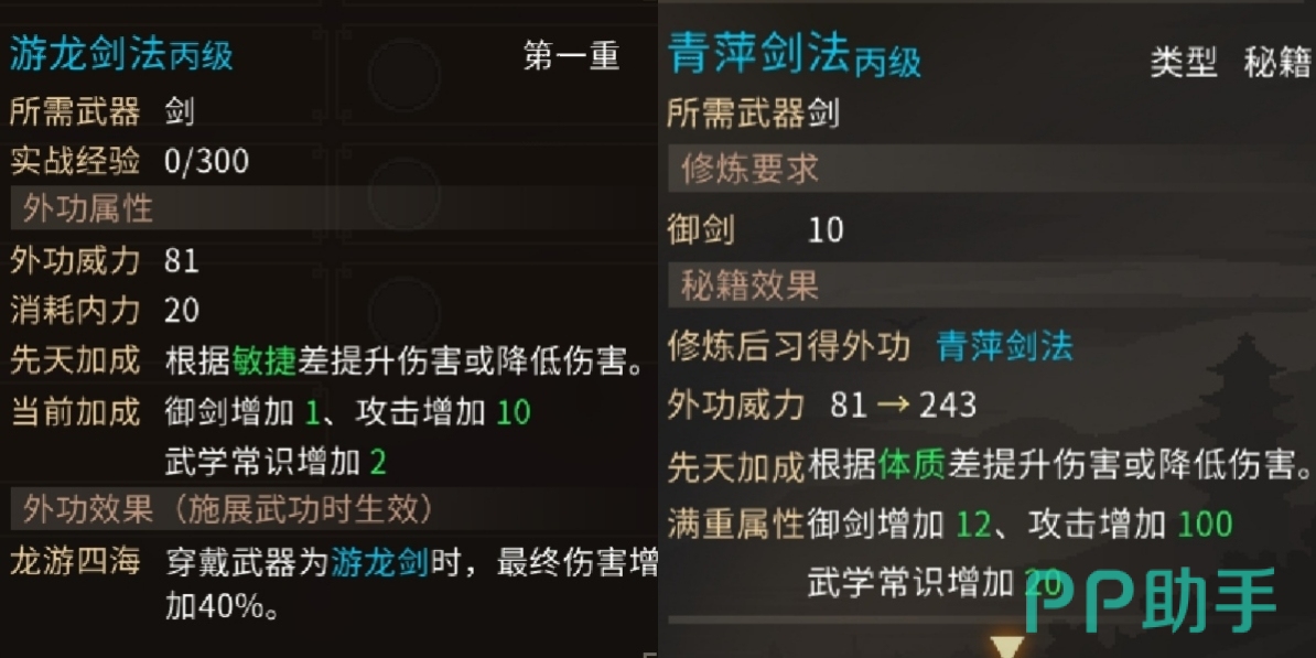达到了20,可以根据敏捷差,来提升自身的伤害,或者降低伤害,在穿戴的武器是游龙剑时,可以使得最终的伤害增加到40%,只有施展武功的时候才会生效,并且可以对御剑以及攻击还有武学常识来进行加成。