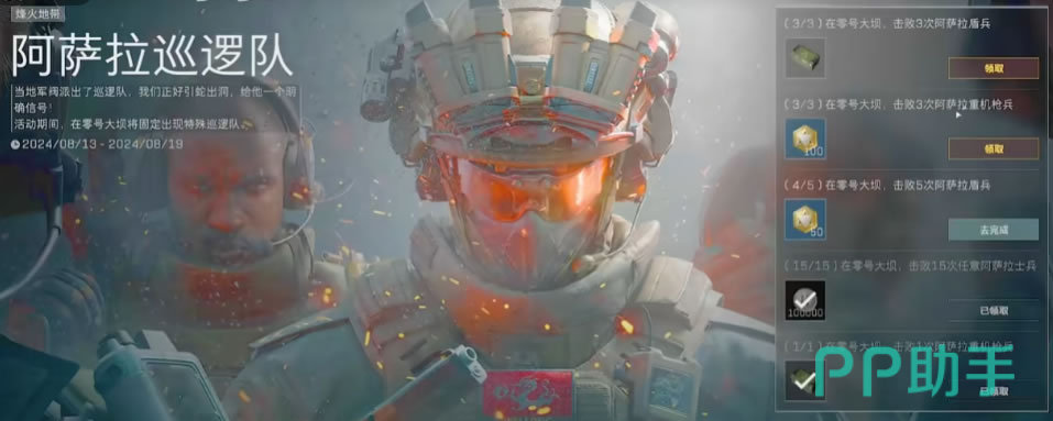 在阿萨拉巡逻队活动中,任务地点是在是在第一章大地图“零号大坝”;任务有各种各样的完成即可领取的奖励,任务本身也并不复杂,比如有击杀阿萨拉盾兵、重机枪兵等,而有些高价值的奖励道具完成条件其实并不困难。比如这次开启的巡逻队活动,只要击杀3个步兵和1个机枪兵,就能拿到2张“仿制的门卡”。