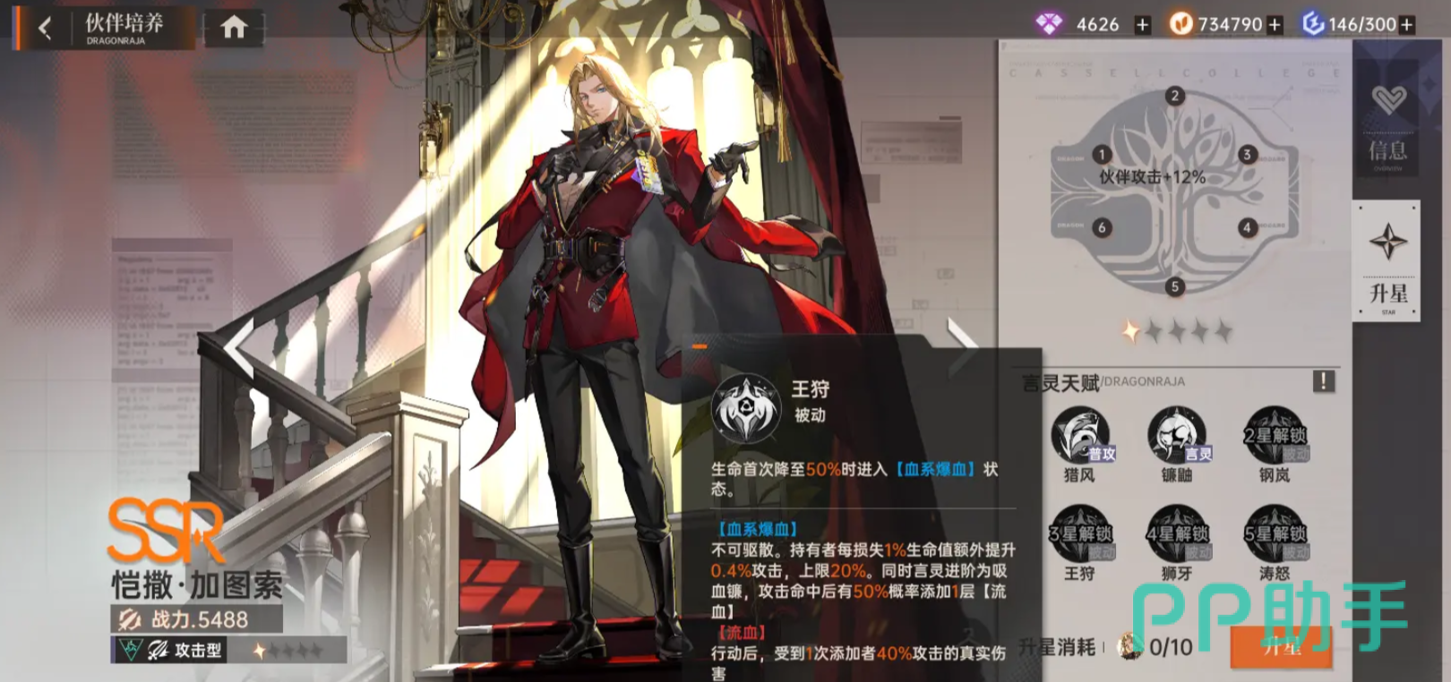 凯撒在2星的时候能激活钢岚,钢岚可以增加15%的伤害,三星的时候能激活被动王狩这能在生命首次降低到50%的时候进入爆血状态,该状态无法被驱散,持有者每损失1%的生命值就会额外提升0.4%的攻击力,并且言灵也会升级为吸血镰,让其在命中后有一半几率添加一层流血。