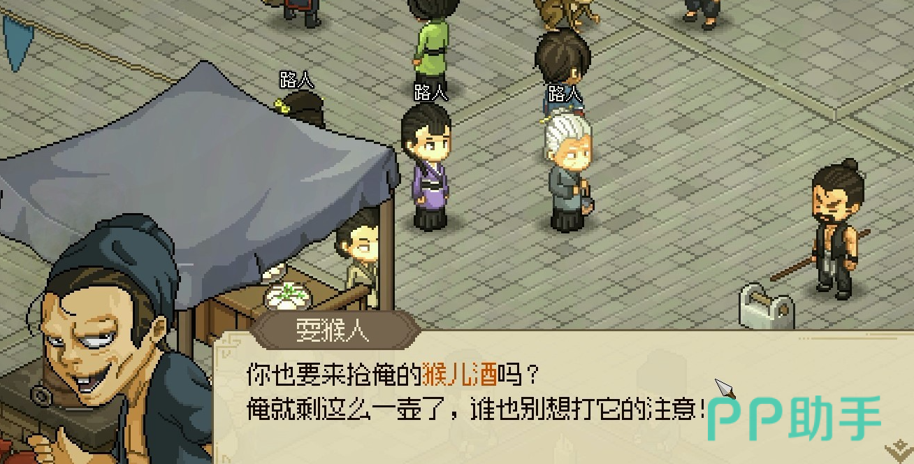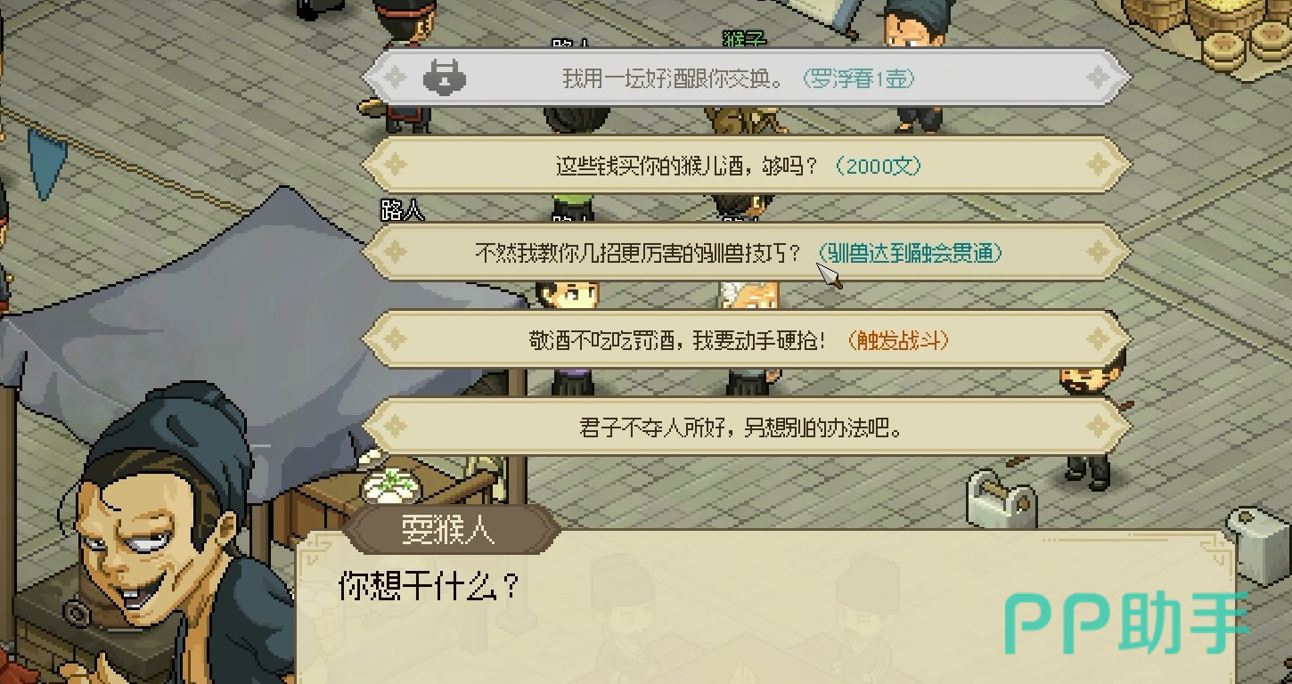 白天到达集市后会发现这里有一个耍猴人,和他对话后找他索取猴儿酒,我们可以选择给他钱或者教他驯兽,这两个选项都能帮助我们获得猴儿酒,但是教他驯兽需要玩家的驯兽等级达到融会贯通。