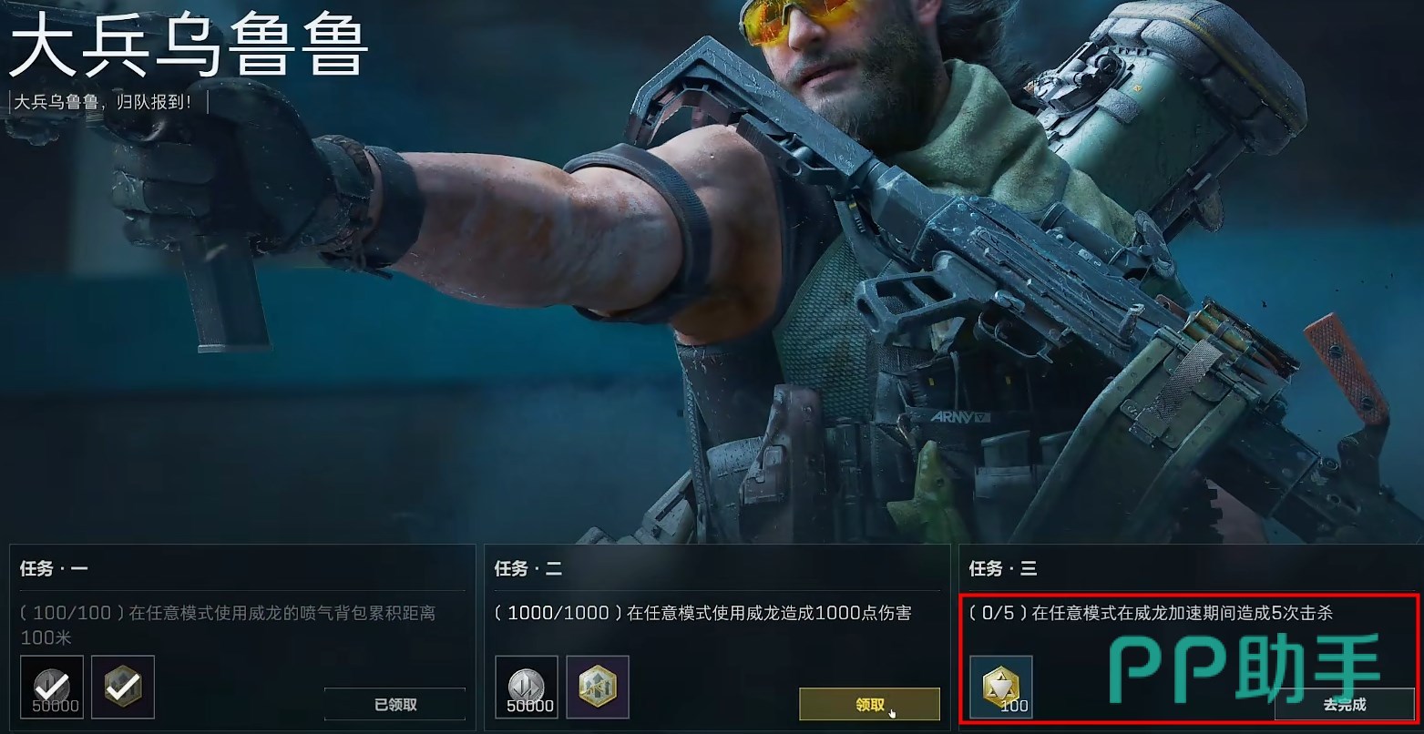 任务1和任务2还是蛮简单的,这两个可以一并完成,喷气背包累计超过100米,按V键使用喷气背包,然后使用武器造成足够多的伤害就可以完成这两个任务。就是这个任务3要在威龙加速期间完成5次击杀稍微有点难度。