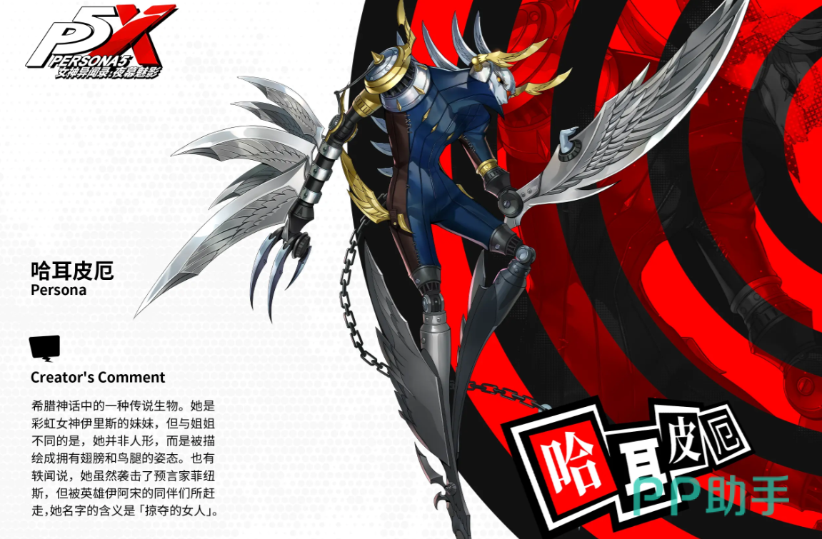 北里基良的人格面具是哈耳皮厄,会作为他的第二战斗形态登场,哈耳皮厄是希腊神话中的一种传说生物,她是彩虹女神伊里斯的妹妹,但是和姐姐不同的是,她并不是人形。
