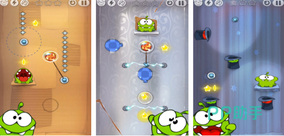 这款游戏趣味性十足,共包含了400多个有趣关卡,能让您体验到甜蜜的冒险。在游戏里还有很多神秘的大礼包,需要玩家来寻找,当收集金星以及糖果之后,就可以找到隐藏的奖品。玩家最主要的任务帮助小怪物来获得糖果,游戏中的糖果都利用绳子吊起来,而割绳子的同时可能会被其他生物将糖果吃掉,因此要开动脑筋正确割绳子。