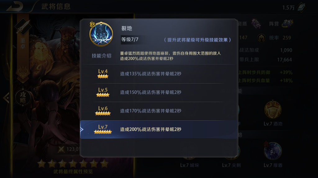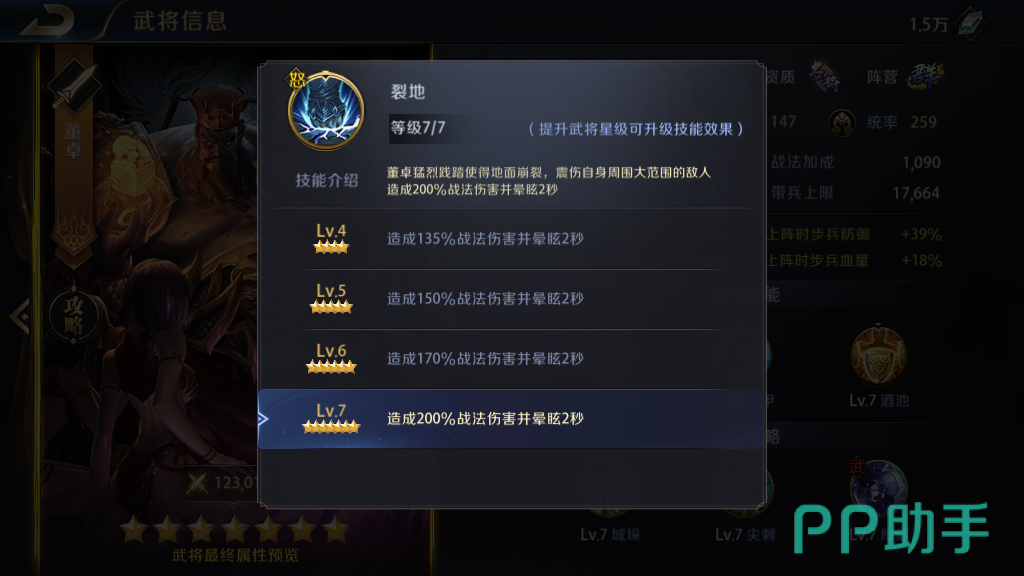 这里小编就推荐大家使用暴君董卓这个步兵将领,在游戏中董卓作为步兵的名将。在获取的方式上是相对比较容易获得的,在本次的关卡中董卓的技能形态非常的适合。首先是怒气技能“裂地”,在造成伤害之后还能够对自身一定范围的敌人施加眩晕效果。
