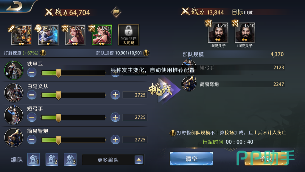 那么在玩家在解决了发展方面的问题之后,在关卡的挑战方面武将的选择就是比较重要的一点了。在本次的关卡中玩家面对的是车兵部队的攻击,而游戏中的步兵是克制车兵部队的,所以在武将的选择上应该选择步兵将领。
