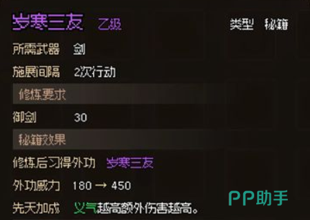 大侠立志传岁寒三友获取方法后使用的条件以及使用之后能带来的提升作用都已经介绍出来了,如果平常比较喜欢用剑攻击的话,那就可以去指定的位置收集岁寒三友这个秘籍,这是一个乙级的秘籍,整体的能力属于中等偏上,是绝对是能为玩家带来帮助作用的一个秘籍设定。