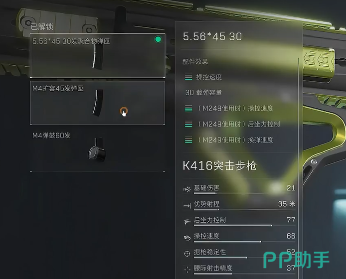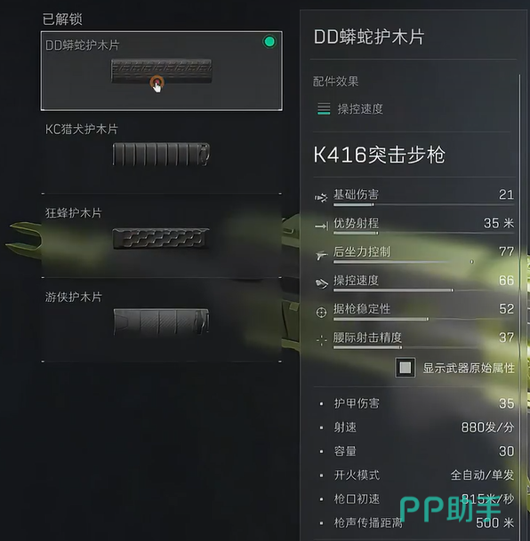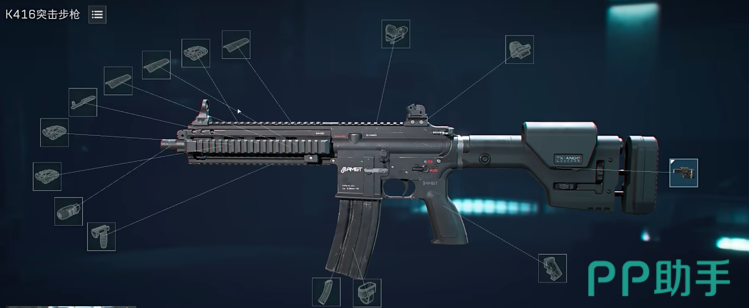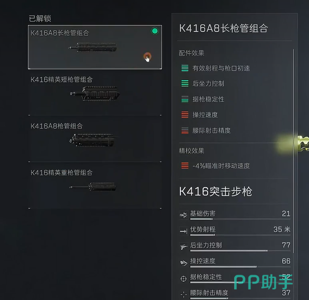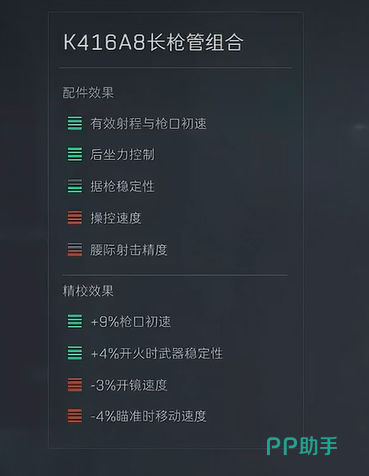 枪管选择A8长枪管组合。K416的射程虽然不算短,但要想在中远距离压制敌人,射程的提升尤为重要。A8长枪管组合可以将射程延伸到35米,这也是K416的最大射程范围了,对于一些对抗远距离敌人的场景非常有帮助。