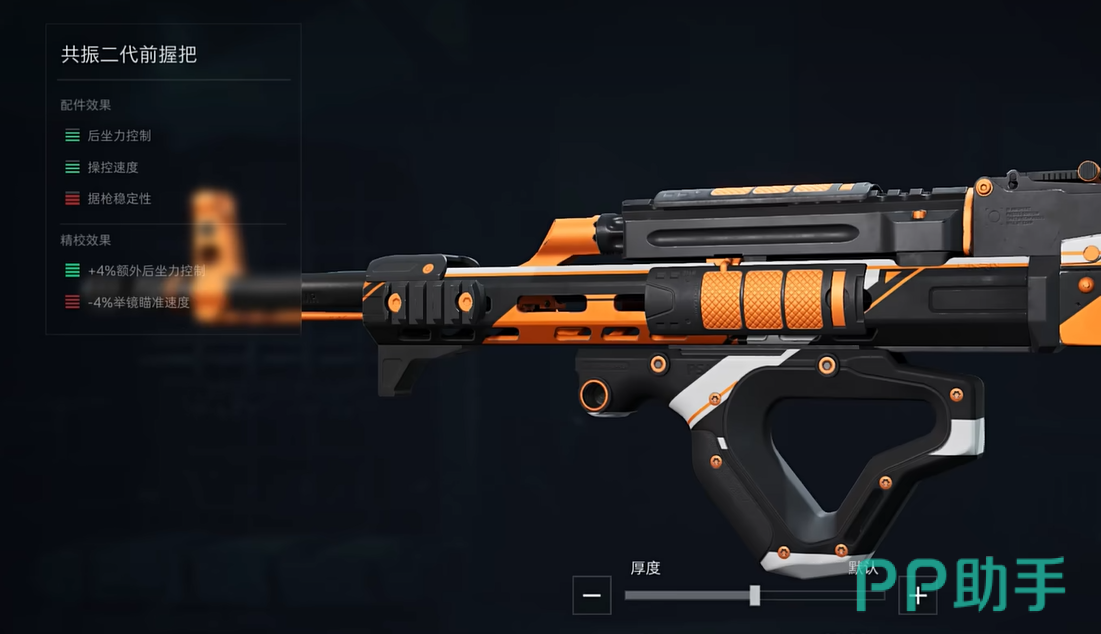 第二套改装方案则更适合喜欢冲锋陷阵的玩家。它专注于提升近战的火力输出和机动性,虽然操作难度较高,但一旦掌握,这套配置在近战中的表现会非常出色。导轨依然使用紫色镭指+3猎犬护木片,保证移动中的瞄准精度。枪管选择海狸长枪管组合,这可以增强近战火力输出并兼顾射速的稳定性。枪口则推荐精密战术消音器,虽然在近战中会略微降低伤害,但能保持一定的隐蔽性。前握把继续选择实用斜角握把,帮助控制后坐力,保证在连续射击时枪口的平稳。枪托使用精英轻型枪托,大幅提升灵活性,让你在转移目标时更加迅速。后握把依然选择AK镂空握把,以保证长时间作战的舒适度。供弹选择30聚合物弹匣+快拔枪套,能够保障持续输出,并减少换弹时间。