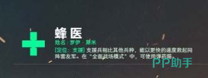 蜂医的定位是支援兵种,是阵营搭配中不可或缺的一个兵种,玩家一般在全面战场模式中使用该角色比较频繁。蜂医的最经典的战术装备就是激素枪,显而易见,该枪支最大的特点是进行治疗。不同于其他单一的治疗工具,玩家按下开关就可以同时治疗多个队友,同时还会抑制队友的异常状态从而保证治疗过程顺利。在必要时候,玩家还可以长按此操作达成对自己进行治疗的目的。