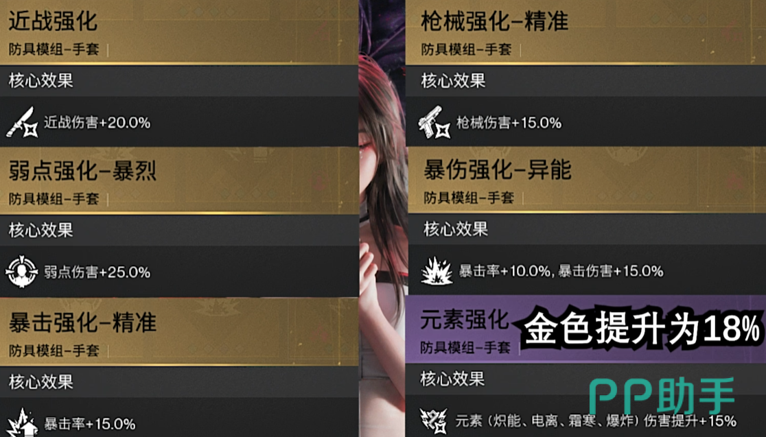 元素强化,元素(炽能、寒霜、电离、爆炸)伤害提升增加18%。
