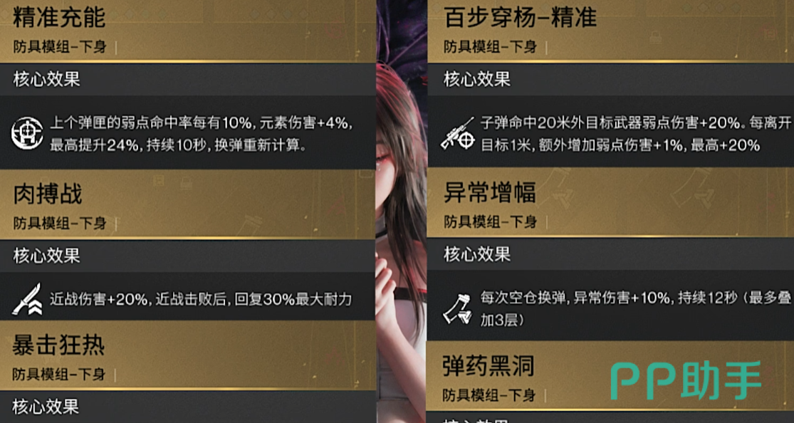 百步穿杨,子弹打中20公尺外目标的时候武器弱点伤害增加20%,每离开目标1公尺,额外增加弱点伤害1%,最高增加20%。