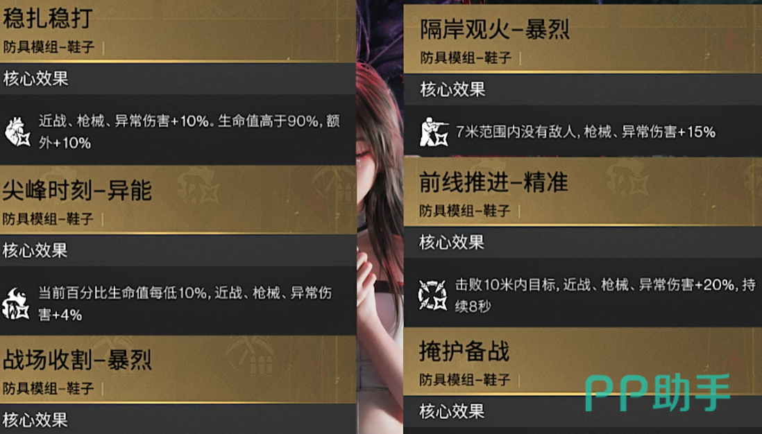 稳扎稳打,近战、枪械、异常伤害增加10%,血量高于90%时,额外增加10%。