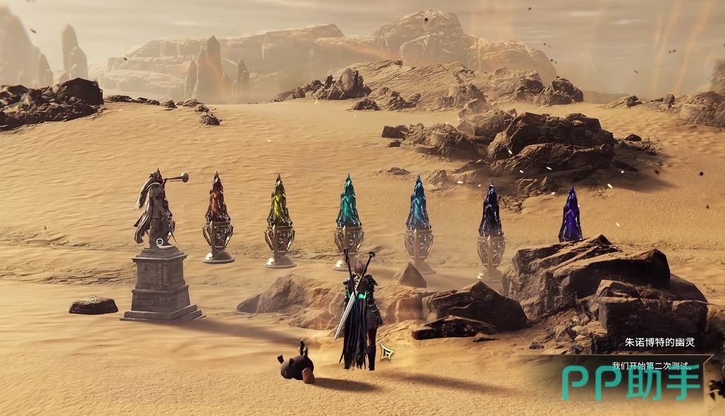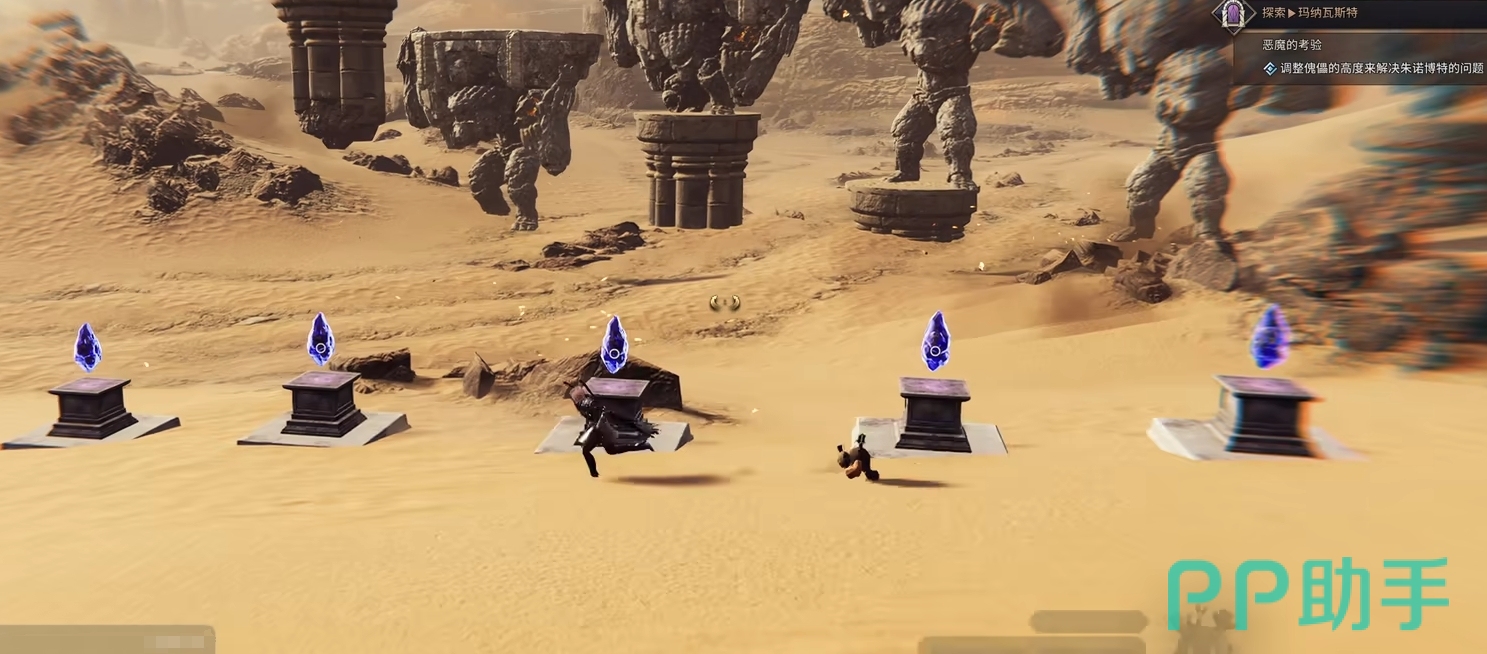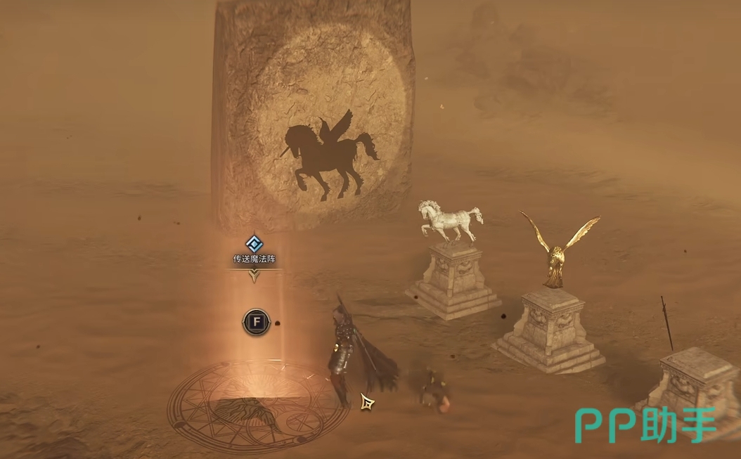 首先第一个考验的流程非常简单,只需要看着前面大石柱上的阴影,然后去调整角色旁边台子上的雕像即可,一共需要调整三次,一只马,一只金雕还有一把剑,按照墙壁上的阴影慢慢调整即可完成。