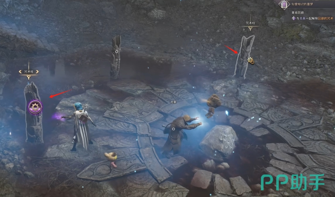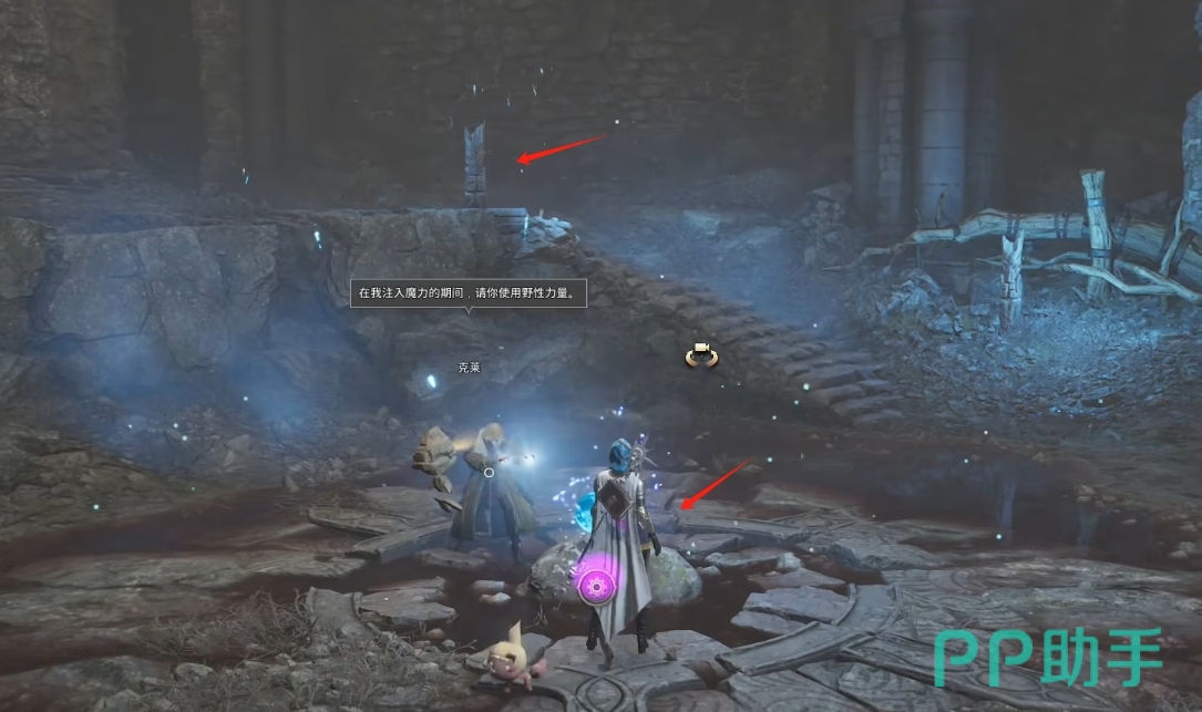 第二阶段的柱子交互更简单,先和克莱对话完,然后把它面前的设施交互一下,然后往右边阶梯上面走,到上面高台后顺着往前走,按前进的顺序将见到的柱子逐一交互一遍即可,两个都交互完后回去与克莱第三次对话接着按照任务指引到后面击败两个小怪和梦魇boss即可。