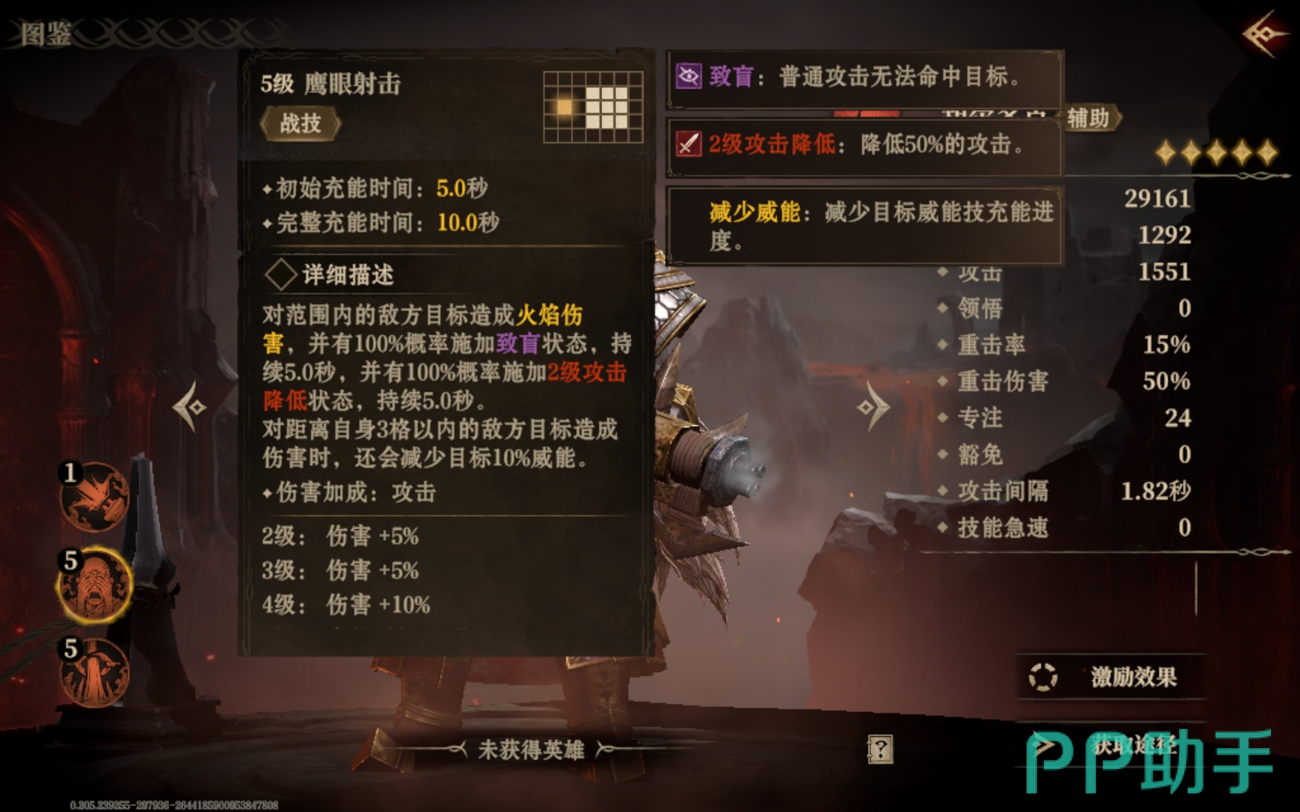 五级的时候可用的技能就变多了,鹰眼射击就是其中之一,这一招可以对固定范围内的所有敌人造成伤害,同时还能影响它们的视野并降低它们的攻击力,当己方处于劣势的时候,可以发动这个技能去压制对手,为小队赢得喘息的时间。