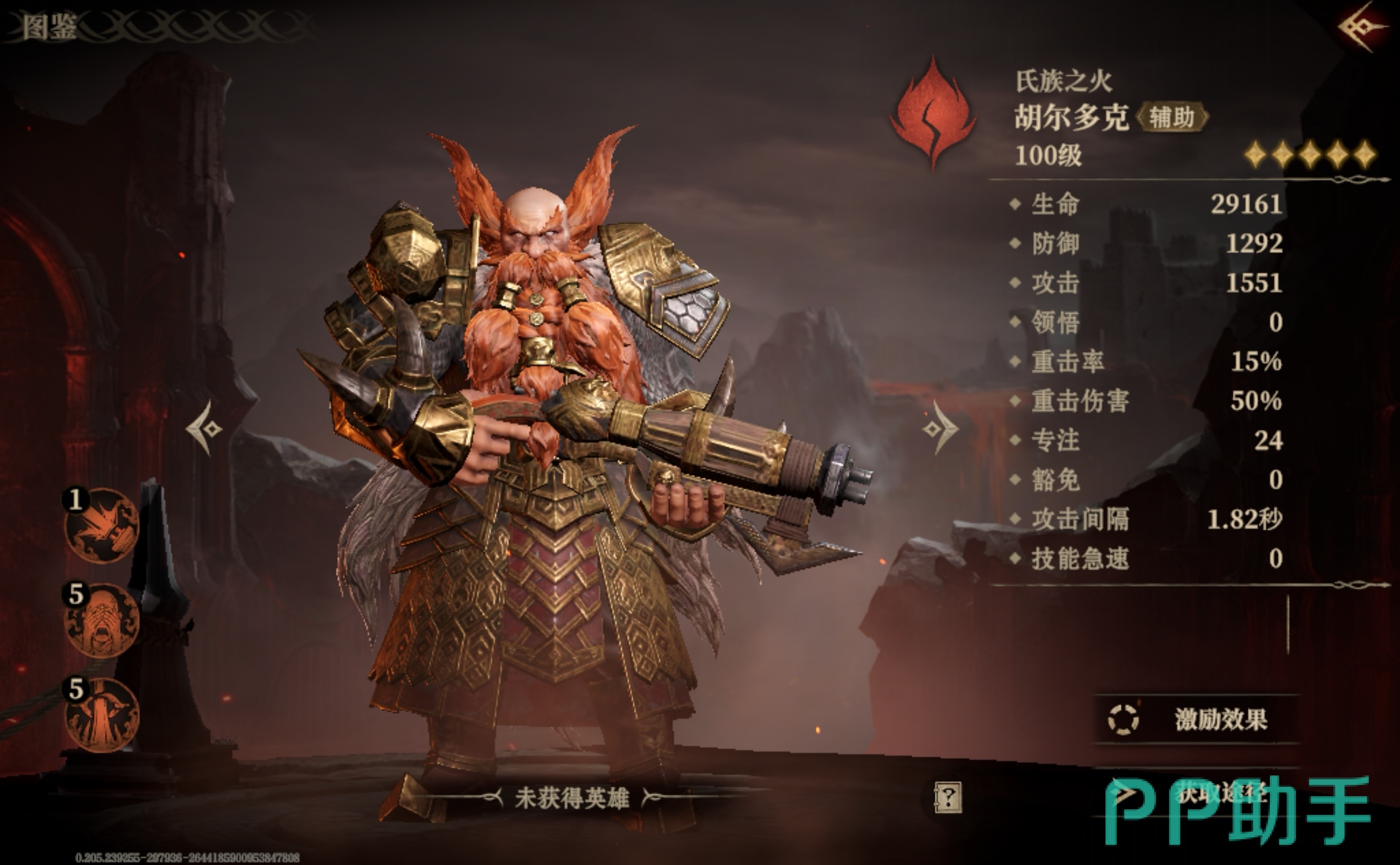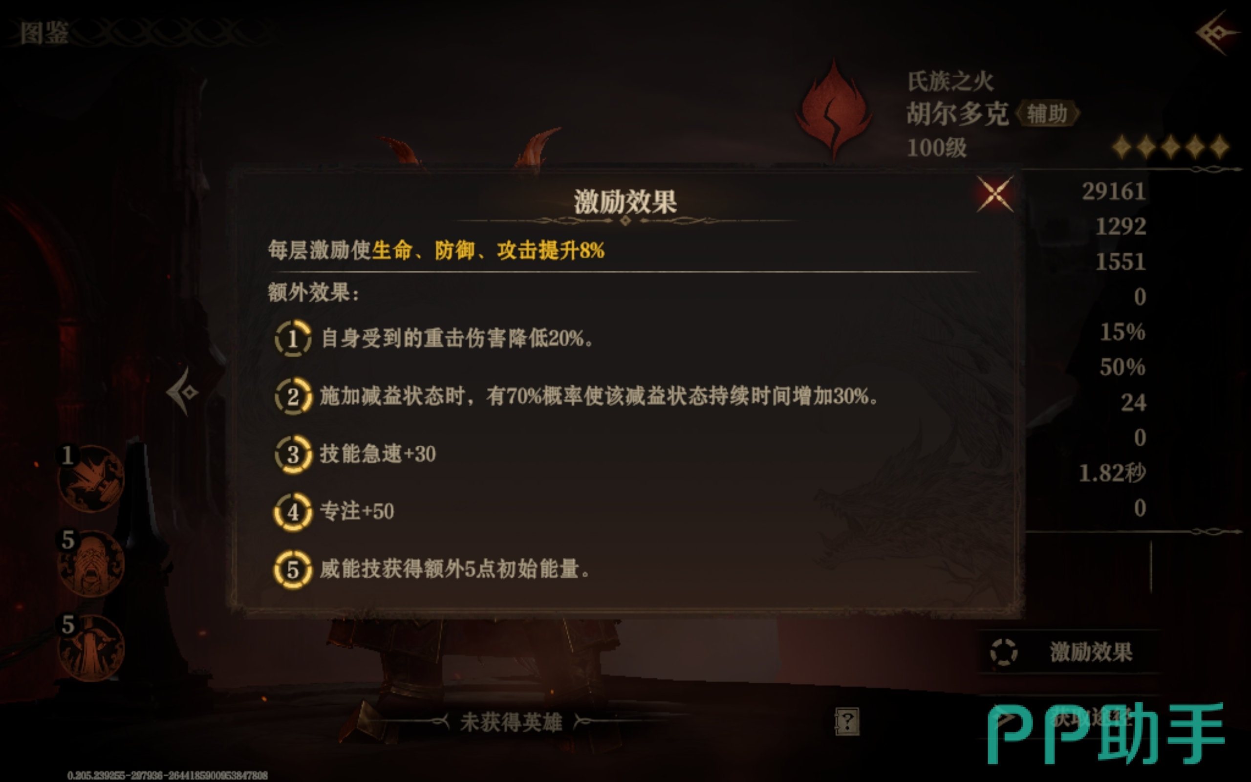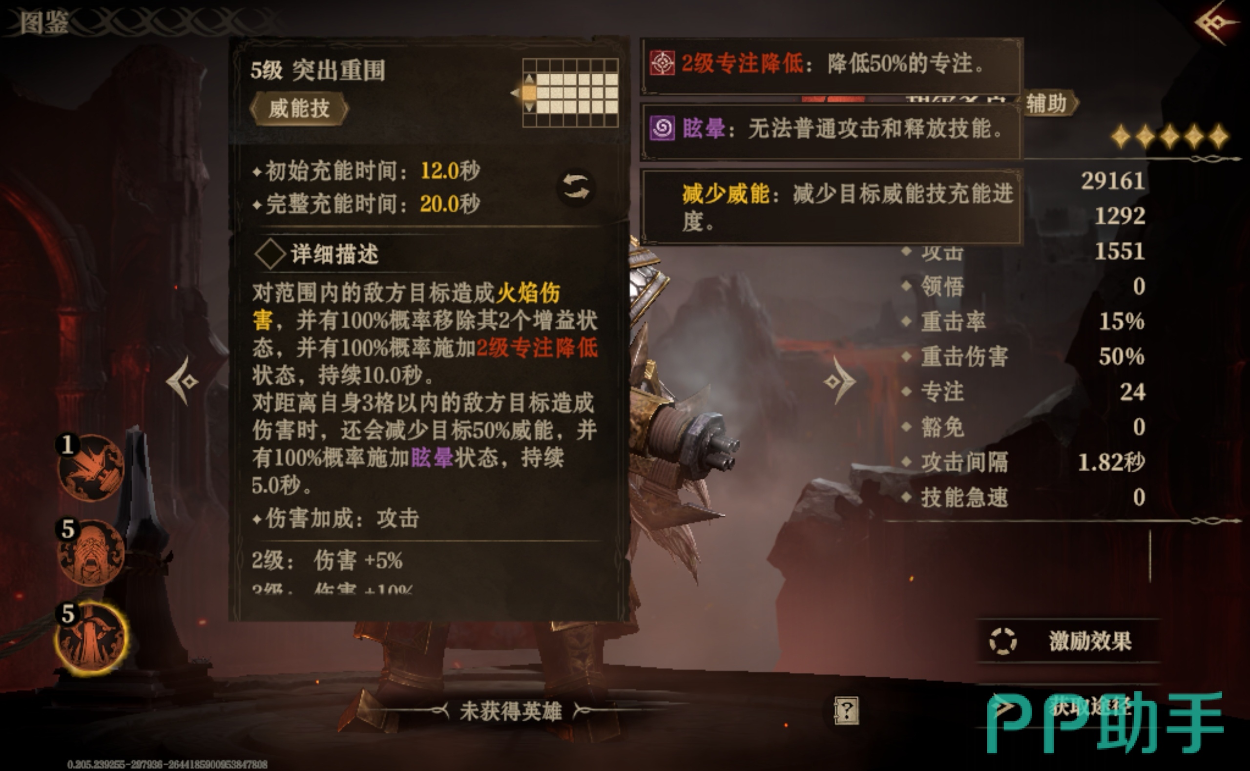 胡尔多克的威能技叫做突出重围,技能触发之后,攻击范围内的敌人不仅会遭受火焰伤害,当前所拥有的增益也会被减少两个,同时专注值也会变低。要是对面的英雄与胡尔多克相距不超过三格的话,那么还会陷入眩晕的状态下并持续五秒钟。
