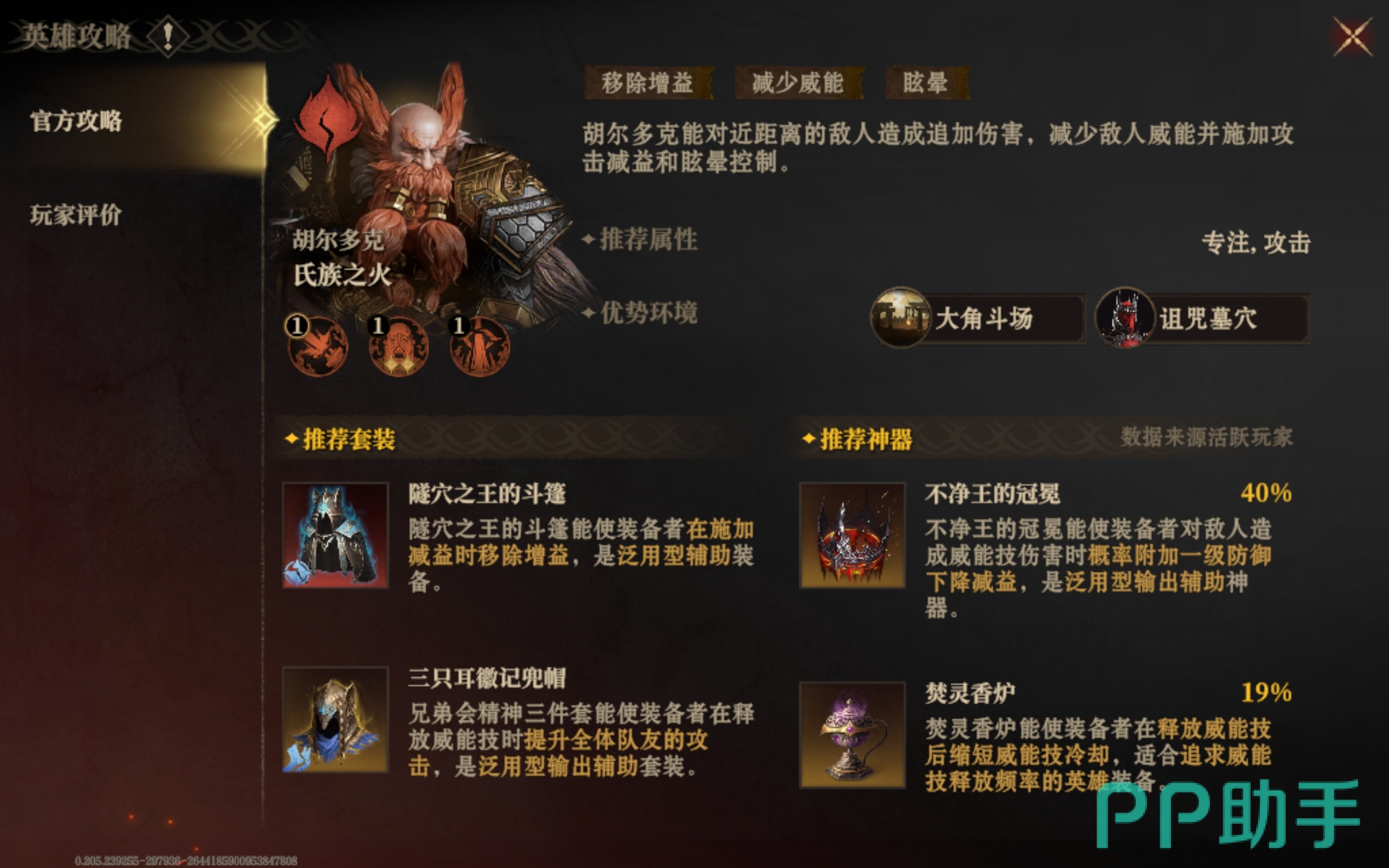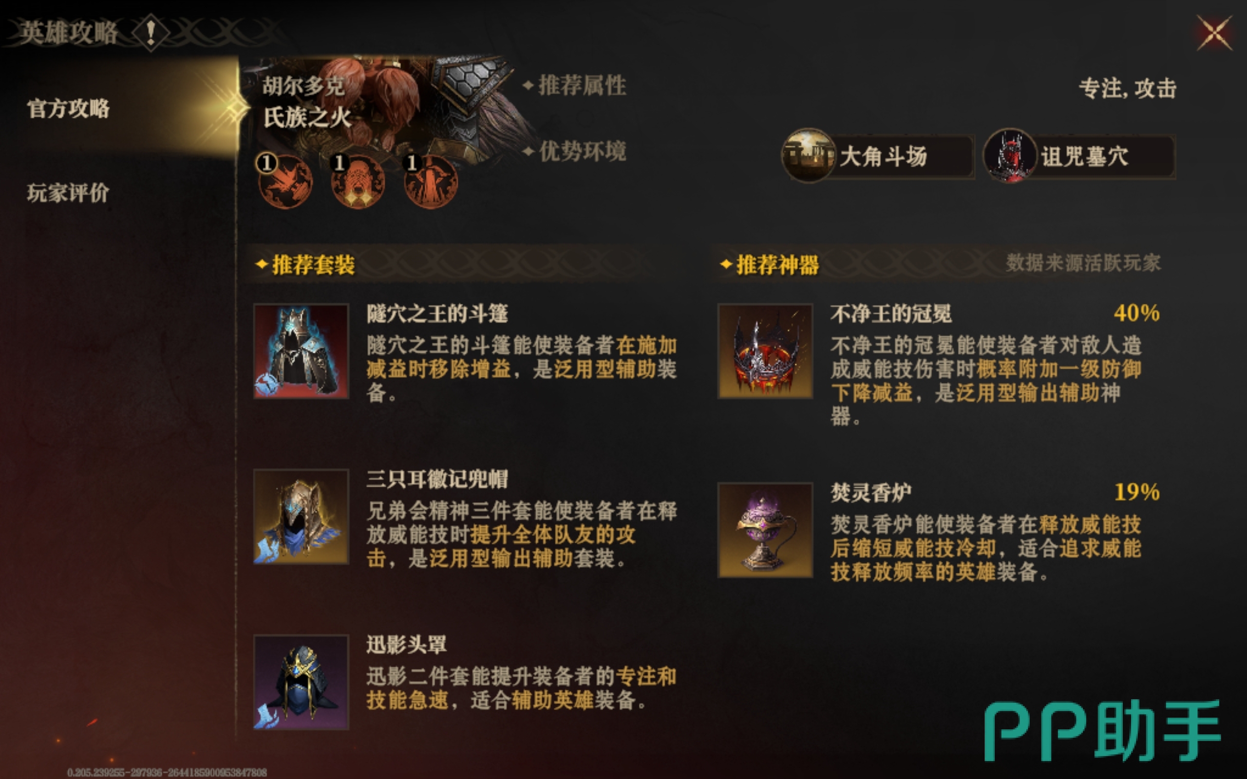 在挑选套装和神器的过程中,大家要尽量发挥英雄自身的优点,而不是弥补它的短板,比如给胡尔多克选择装备时,就要挑那些能提升它专注和攻击的配件,要是你不知道该选什么,那么可以试试焚灵香炉、隧穴之王的斗篷和迅影头罩。