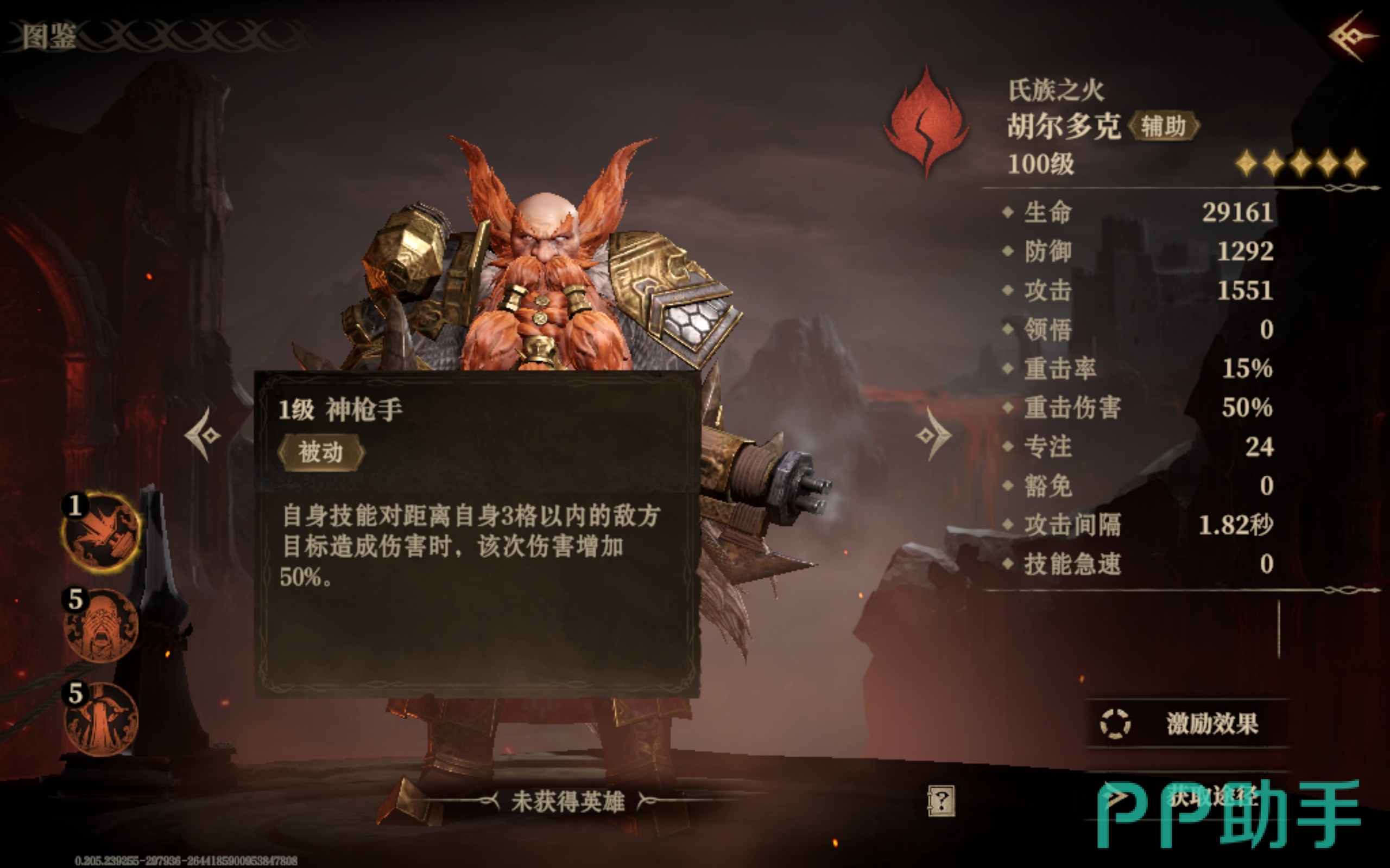 胡尔多克一级的时候自带一项叫做神枪手的被动技,英雄所攻击的目标要是距离在三格以内,并且被技能成功命中了,那么这一次攻击的伤害会更高,如果对面的输出血量不高的话,那么可以操作胡尔多克去消灭它。