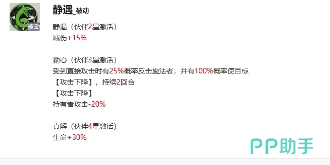 曼因不仅拥有强大的主动技能,其被动技能同样是不错的,这些被动技能为他在战斗中提供了额外的生存和反击能力,使他成为一个更加全面的角色,当曼斯达到2星时,他的被动静遏会被激活,这个技能可以增加自身15%的减伤能力,这种增益效果使得曼斯在战斗中能够承受更多的伤害,同时这种减伤效果也能够提高整个队伍的生存能力。