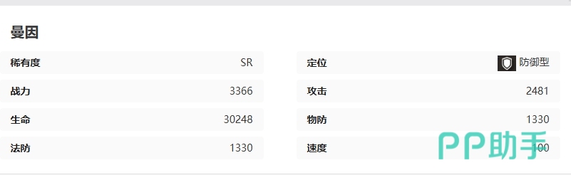 基础数值上面他的生命值高达30248,战力值也达到了优秀的3366,此外他的攻击力也十分出色,达到了2481,同时他的法防和物防效果均为1330,这使得他在战斗中具有很高的生存能力,虽然曼因的速度并不占优势,但他依然非常适合在前排保护队友,所以在队伍中可以说曼因是一位非常实用的防御型角色,他的技能可以增加自身的减伤能力、反击能力和生命值。
