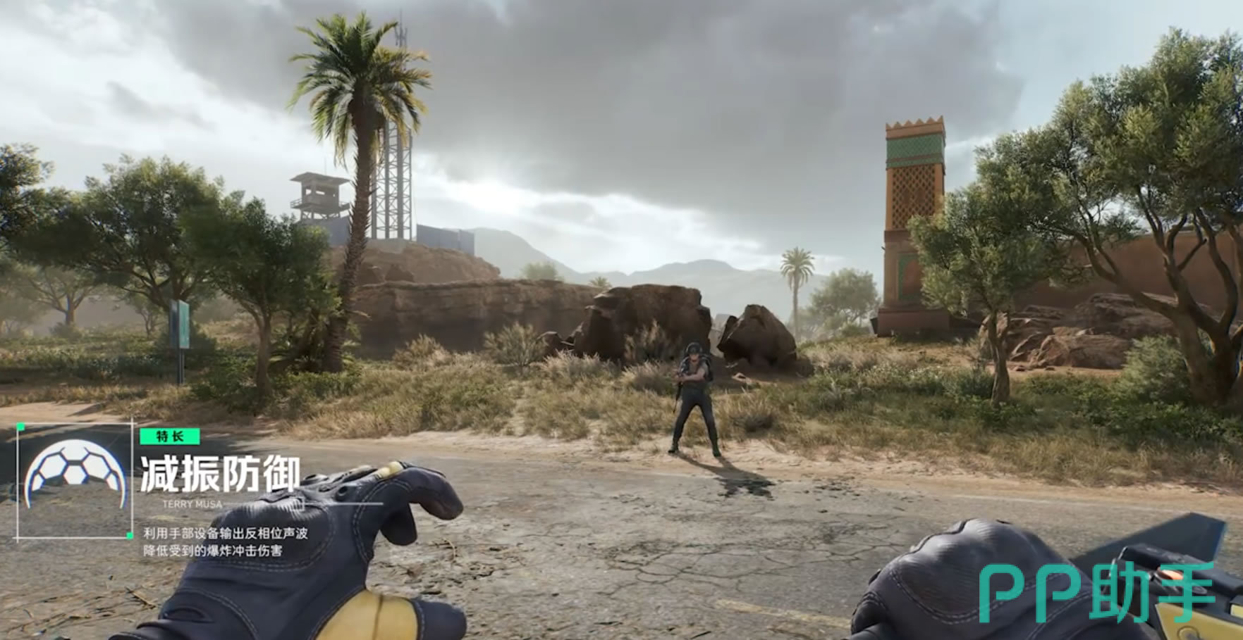 泰瑞·缪萨的特长是“减振防御”,效果是使用手持的特殊设备产生反相位声波,从而降低区域内的爆炸冲击伤害。