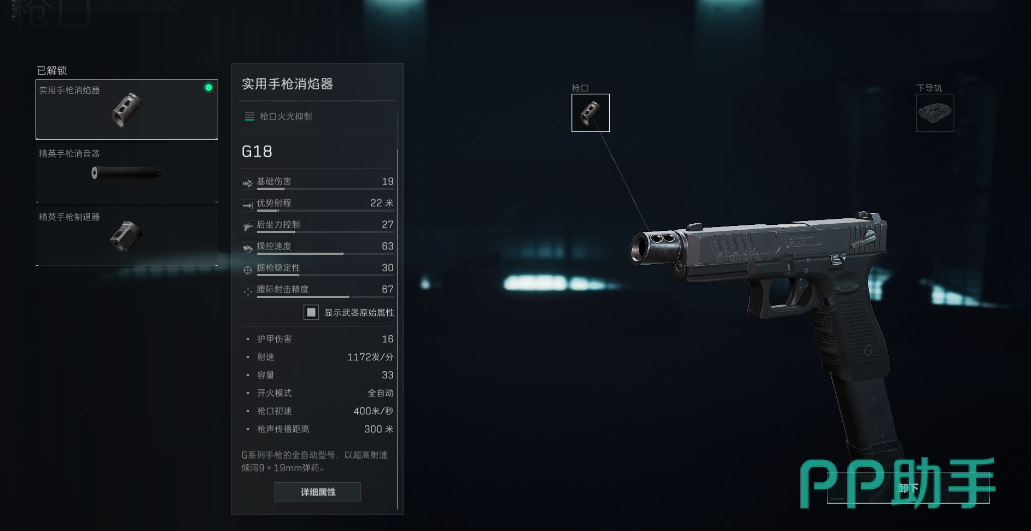 玩家如果想要改装G18C,那么在改装的时候要选择G18作为基础条件,可以使用手枪的消焰器。一旦使用的话能够有效的控制后坐力,并且它不会降低操控速度,玩家在使用的时候会发现它的开枪火焰效果会得到改善。