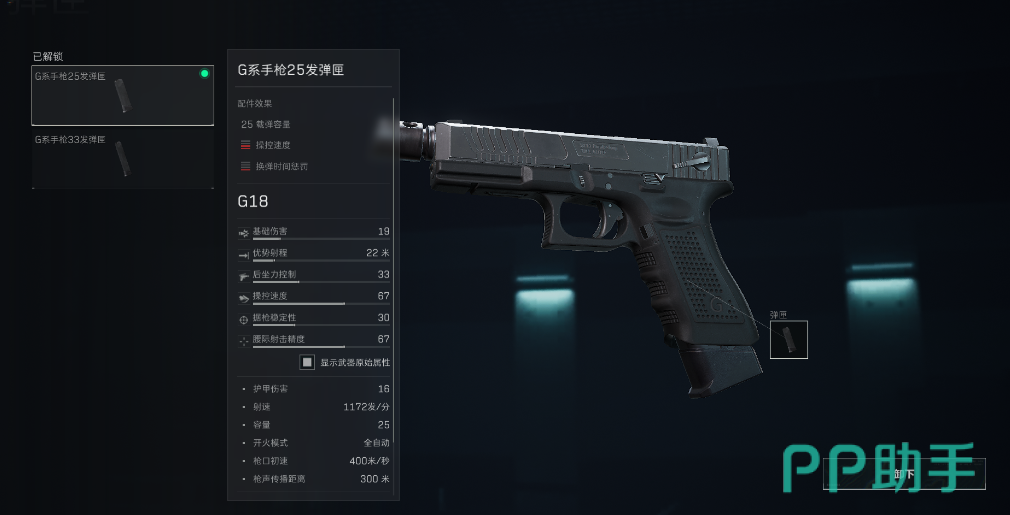 在弹匣方面的话,其实是根据玩家的个人喜好,可能有些玩家会喜欢25发,也有些玩家会喜欢33发。不过玩家需要注意,既然是改装G18C,那么条件允许的情况下,建议玩家选择33发的弹匣。因为这样的话,能够增加它的性能,也能够提高子弹的容量。