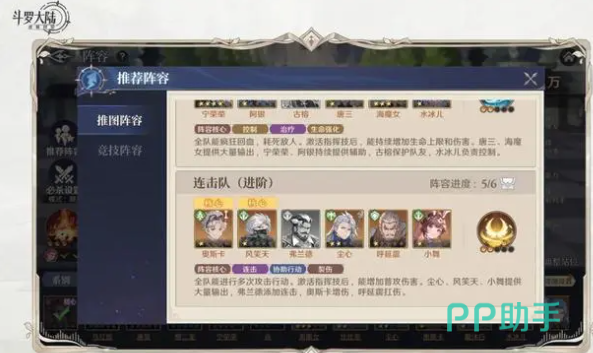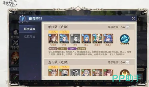 宁荣荣+阿银+古榕+唐三+海魔女+水冰儿:这是第1个阵容,在这一个阵容中最无法忽视的是宁荣荣还有唐三。阵容的特点是兼具治疗能力以及控制能力,全队都可以疯狂的回血,而且输出不低,非常擅长持久战,可以有效增加全队的血量上限。